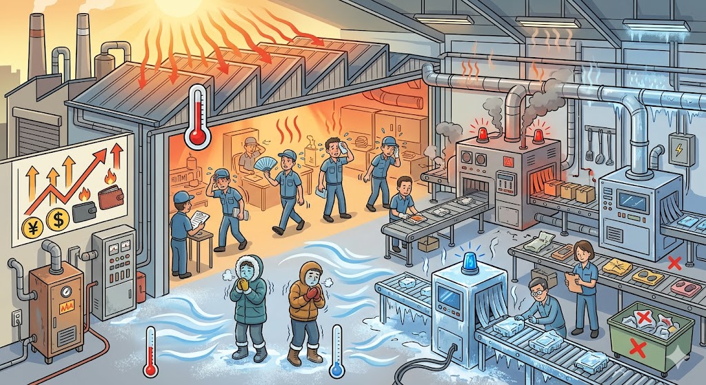 👉 その結果、夏は冷房が効かず、冬は暖房が逃げる状態になり、光熱費がかさみ、作業者の負担も増えます。