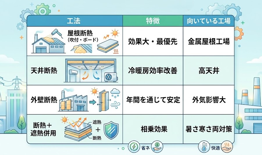 遮熱だけでは補えない「熱の出入り」を抑え、一年を通して安定した工場環境をつくります。