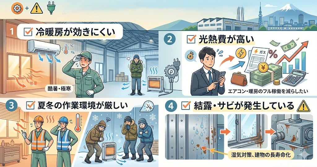 ●夏は屋根からの熱で室温が下がらない ●冬は底冷えして作業がつらい ●電気代・燃料費が年々上がっている ●機械や製品が温度影響を受ける |
