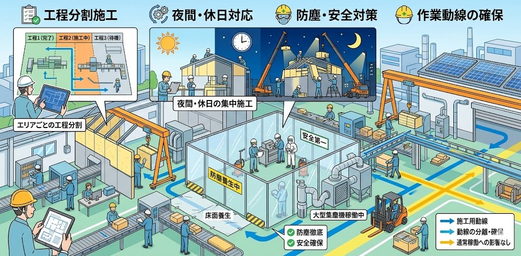 ●工程分割施工 ●夜間・休日対応 ●防塵・安全対策 ●作業動線の確保 |
