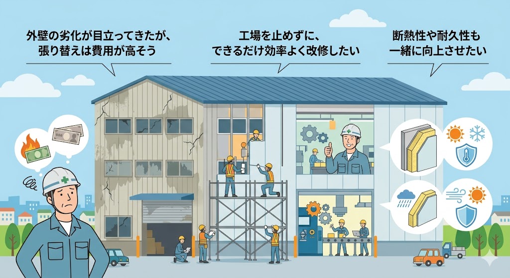 豊川市で工場を所有・管理されている方から、**こうしたご相談が増えている中で注目されているのが「外壁カバー工事」**です。