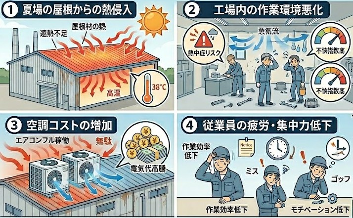 ●夏場の屋根からの熱侵入 ●工場内の作業環境悪化 ●空調コストの増加 ●従業員の疲労・集中力低下 |