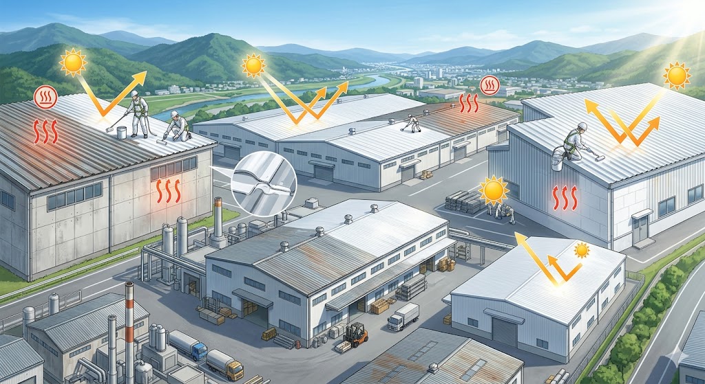 工場断熱塗装とは、屋根や外壁に断熱性能を持つ特殊塗料を塗装し、外部からの熱の侵入・内部の熱放出を抑える塗装工事です。