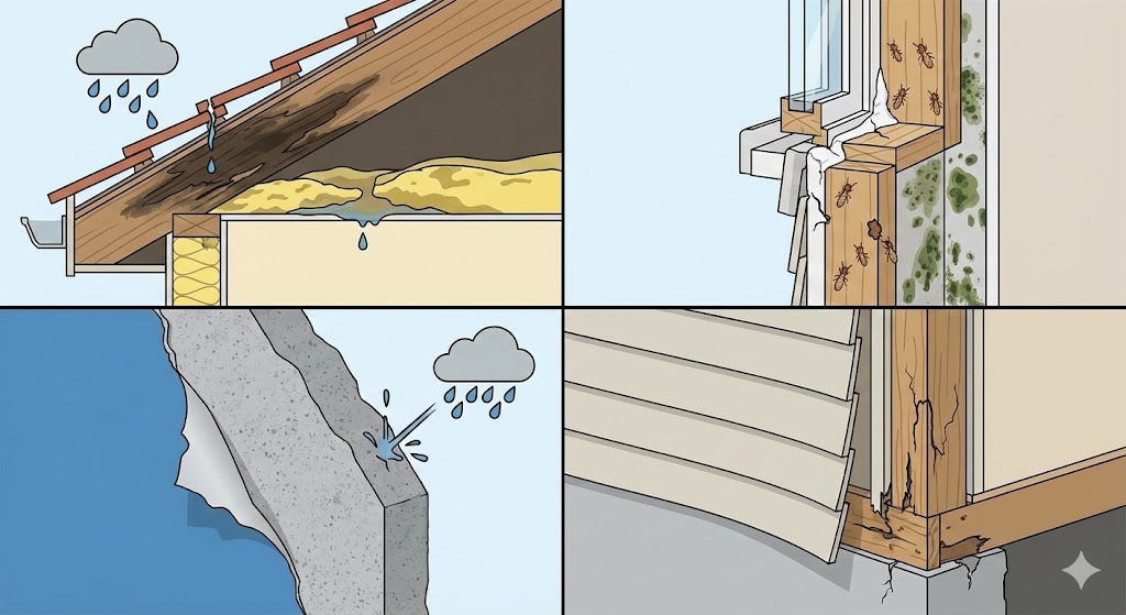 〇雨漏り → 天井裏の断熱材・木材が腐食 〇コーキング劣化 → シロアリやカビ発生 〇塗膜剥離 → 外壁内部に雨水侵入 〇外壁浮き → 建物構造部に影響 👉 「まだ大丈夫」と放置すると、数百万円規模の修繕になるリスクも。 |