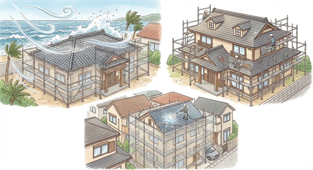 ●風が強く、海風による突風被害のリスクが高い ●屋根形状が複雑な住宅が多い(寄棟・切妻など) ●近隣住宅との距離が近いエリアが多く、飛散対策が必須 |