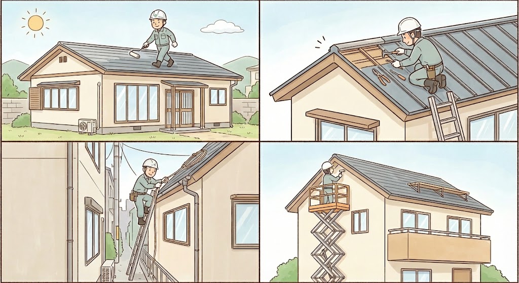 ●平屋で屋根の勾配が緩く、安全に歩行できる場合 ●部分補修(棟板金・縁切り・タスペーサー補修など)だけを行う場合 ●足場設置が困難な狭小地や物理的制約がある場合 ●仮設足場ではなく、昇降足場や屋根足場 を活用できるケース |