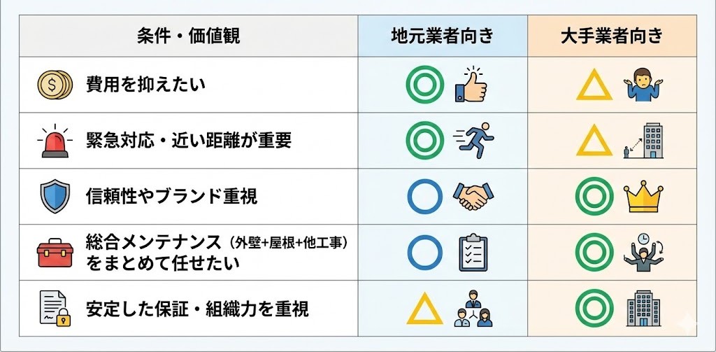 たとえば、築年数が浅く大きなトラブルが想定されにくい家ならコスト重視で地元業者が合うかもしれません。