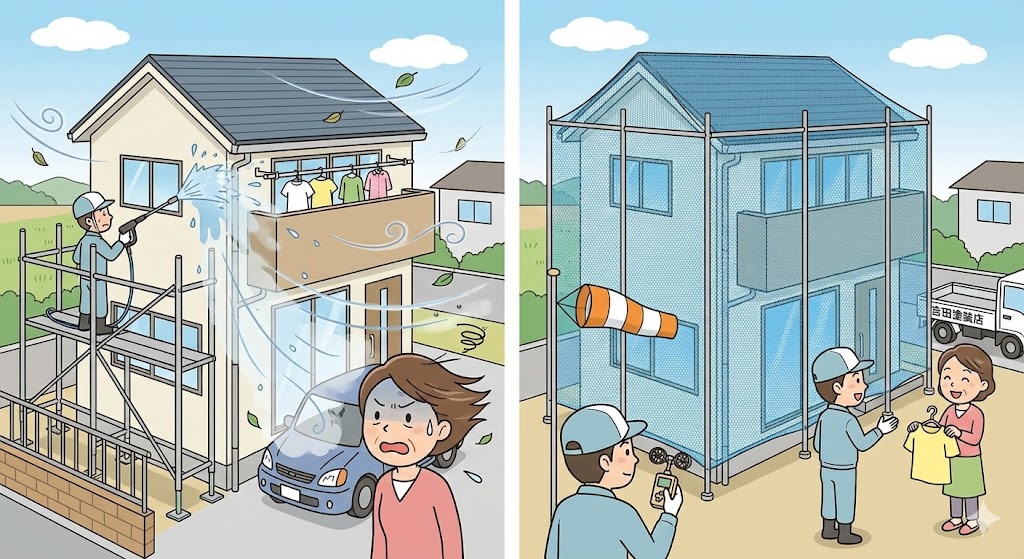 ② 水しぶき・塗料の飛散 高圧洗浄時の水や塗料のミストが、 ➡ 飛散防止ネットの設置+作業時の風向き確認が必須。 |