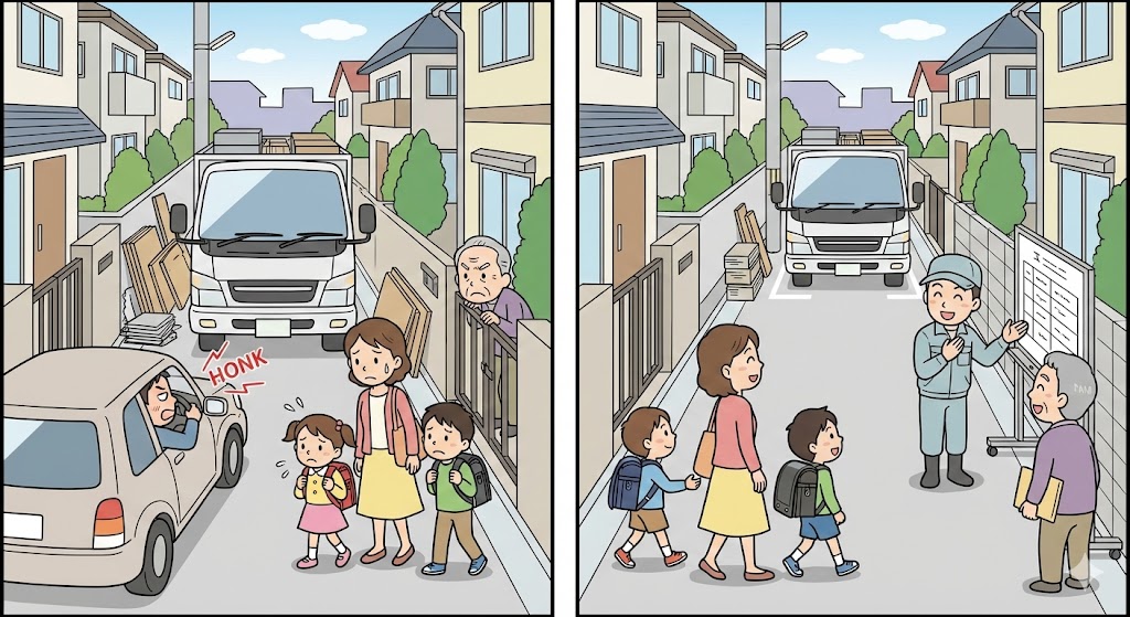 ④ 駐車スペース・通行妨害 職人車両や資材の搬入で一時的に道路をふさぐことも。 ➡ 作業車の位置確認・事前説明が大切。 |
