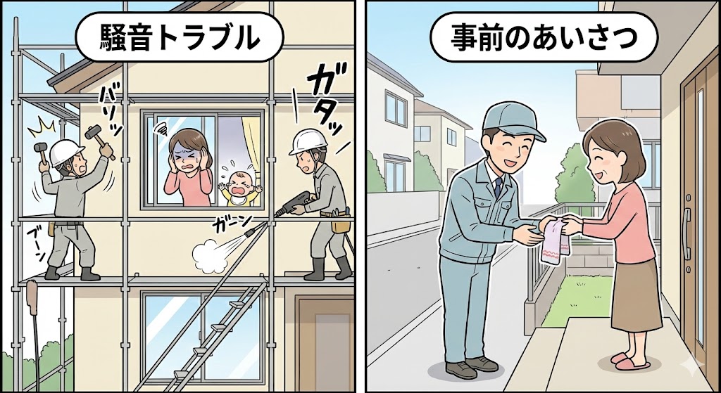 ① 騒音トラブル 足場設置・解体時や高圧洗浄の音は 避けられないもの。 ➡ 事前のあいさつで印象が変わります。 |