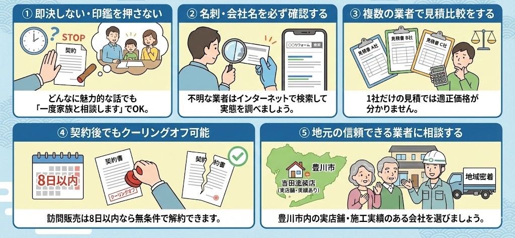 今回は、豊川市で70年の実績を持つ吉田塗装店が、悪質業者の見分け方と、もし来たときの正しい対応法を詳しく解説します。