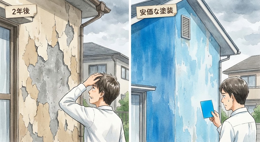 外からはきれいに見えても、実際には塗膜が薄く、1〜2年でチョーキング(白化)・剥がれ・色あせが発生するケースが多数あります。