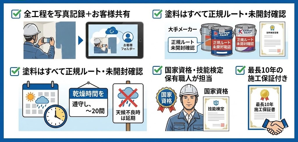 各工程の施工写真・使用塗料・乾燥時間を記録した報告書を受け取れば安心。