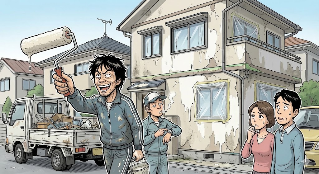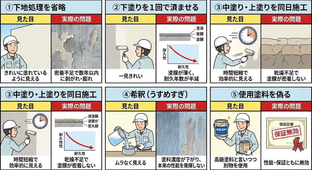 一言でいうと、「塗料メーカーの施工基準を守らず、見た目だけ仕上げる工事」です。