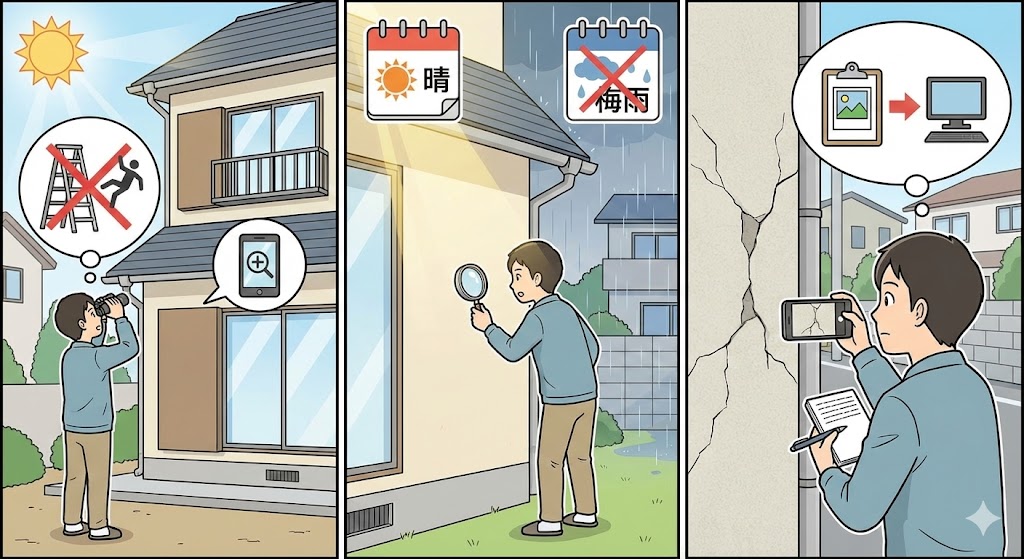 外壁点検を依頼する際は、以下の点を確認してください。 ●点検時に写真付き報告書を提出してくれるか ●調査後に無理な営業をしないか ●外壁・屋根・シーリングを一括で見てもらえるか |
