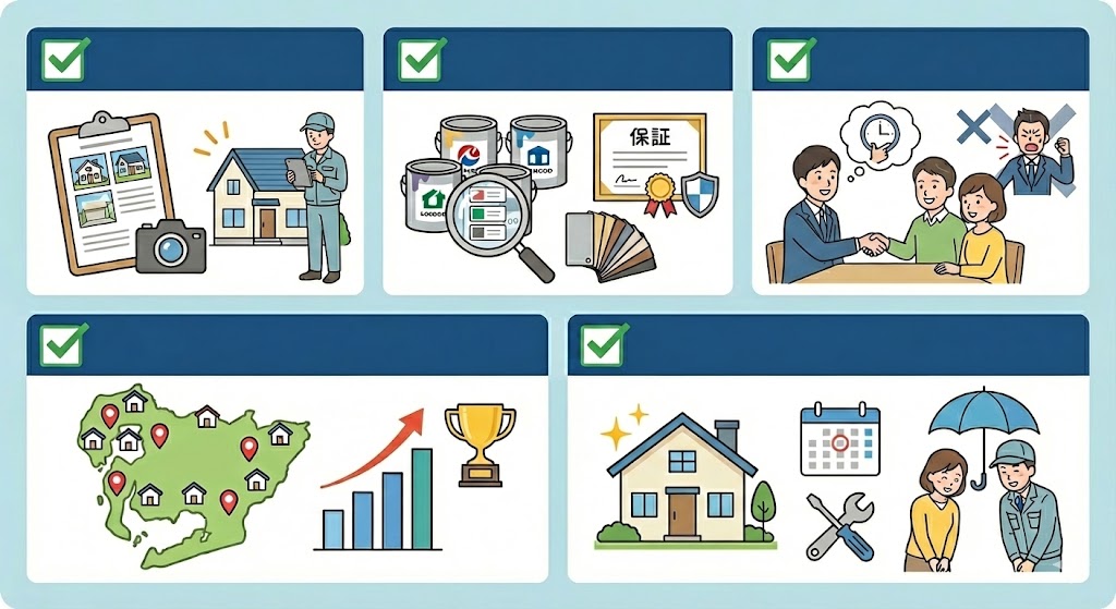 | ✅ 写真付きの現地調査報告を出してくれるか ✅ 塗料・材料のメーカー名や保証内容が明記されているか ✅ 押し売りや即決営業をしないか ✅ 豊川市での施工実績が豊富か ✅ 施工後のアフターフォロー(保証・定期点検)があるか |