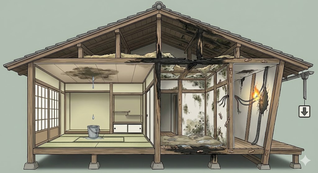 ●天井にシミ(雨漏りの初期症状) ●木材や断熱材が湿気で腐食 ●カビ・シロアリの発生 ●電気配線がショートし火災リスクに ●資産価値の低下 📌 特に築10年以上の住宅では、見えない部分から劣化が進んでいることも多いため注意が必要です。 |