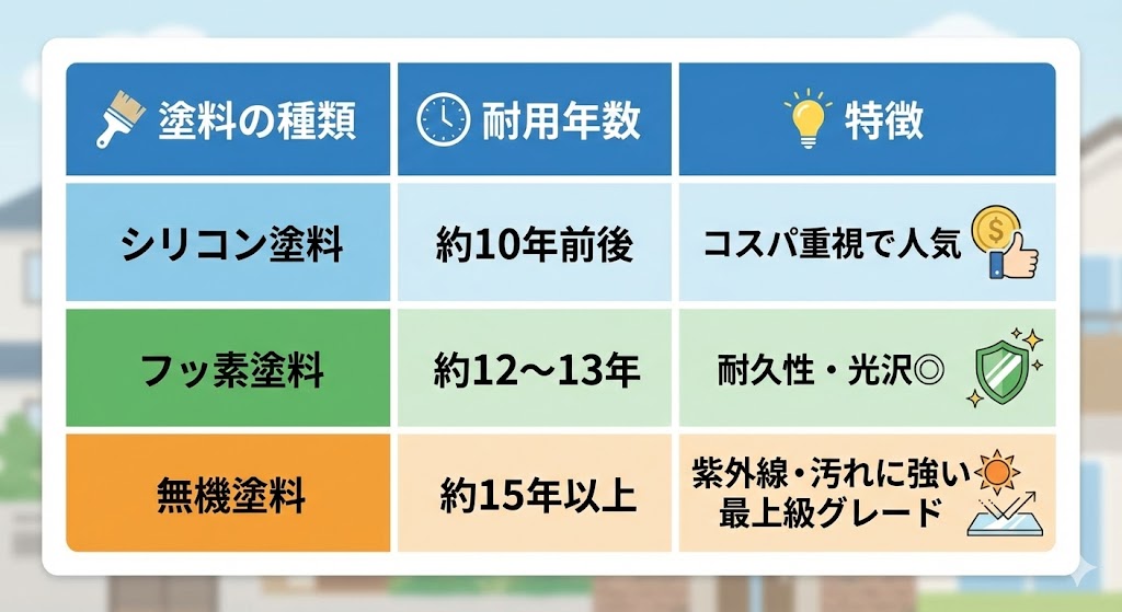 👉 豊川市のような紫外線・湿気が強い地域では、フッ素・無機系塗料が特におすすめです。