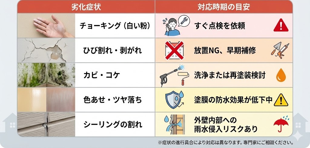 A4. 見た目よりも防水機能の劣化が問題です。チョーキングが出たら要点検。