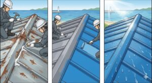 ③ 金属屋根の補修+防水●棟板金の釘浮きを補修し、シーリングを強化 ●防錆塗装+トップコートで寿命を延ばす ●沿岸部のガルバリウム屋根やトタン屋根に有効 |