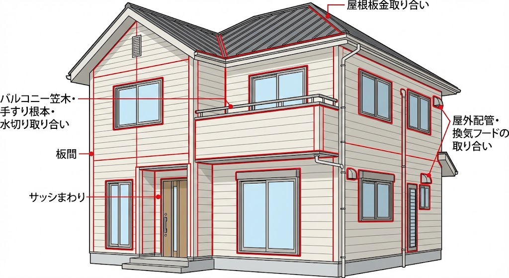 ●窯業系サイディングの縦横目地(板間) ●サッシまわり(窓・ドア) ●バルコニー笠木・手すり根本・水切り取り合い ●屋根板金取り合い(点検対象) ●屋外配管・換気フードの取り合い |