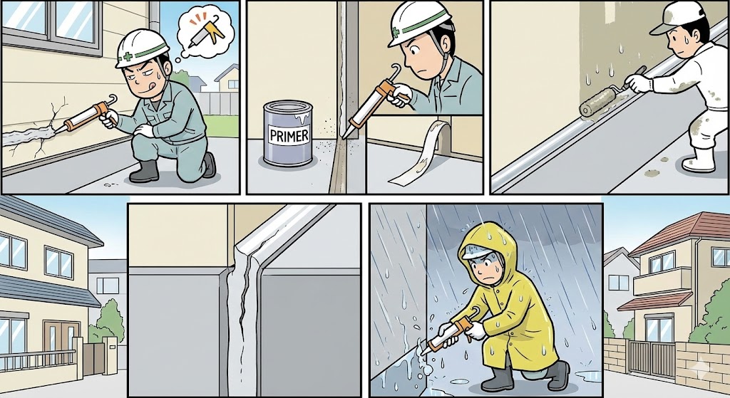 ●既存の上から何でもかんでも増し打ち ●プライマー省略 ●シリコーンの上から塗装してベタつき・艶引け ●三面接着で早期破断 ●雨天・結露時に強行施工 |