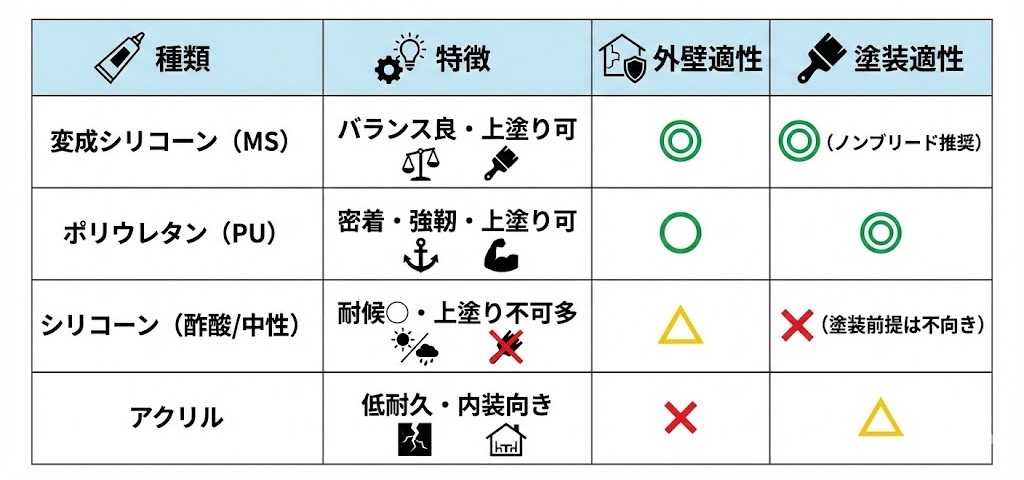 → 言い方が違うだけで、外壁の目地に充填する同じ機能材料と考えてOKです。