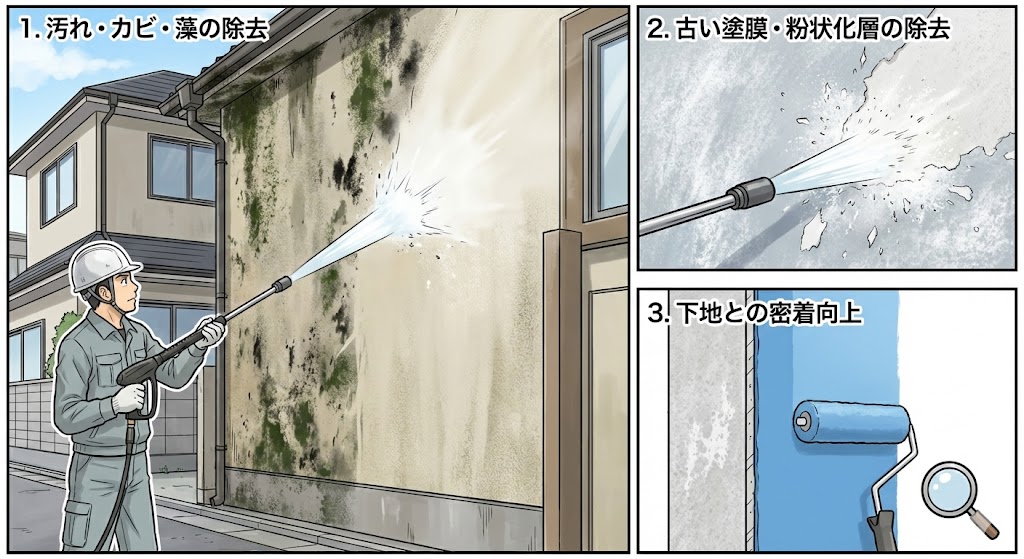 1.汚れ・カビ・藻の除去 2.古い塗膜・粉状化層の除去 3.下地との密着向上 |