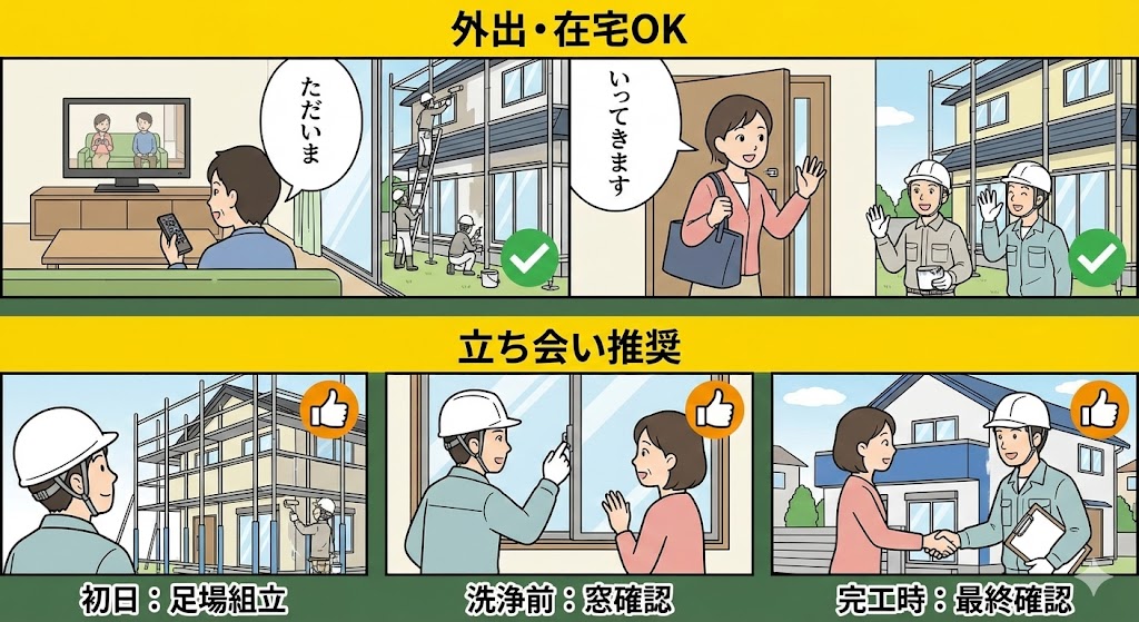 A1. 不在でも問題ありませんが、着工・完了時は立ち会いをおすすめします。