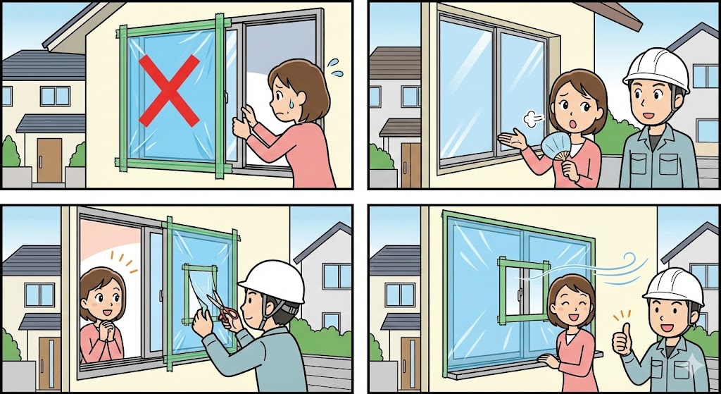 ③【窓の開閉】養生期間中は開けられない 窓やサッシ周りは塗料が飛ばないようビニールで養生されます。 ただし、風通しを確保したい場合は事前に職人へお伝えください。 |