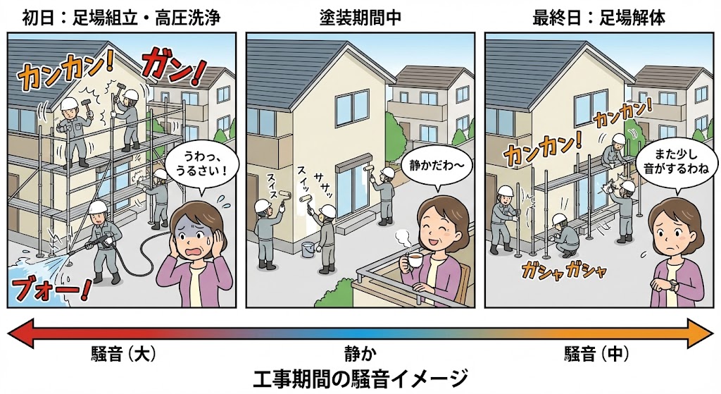 ①【音】足場や洗浄時に少し響く 足場の組立・解体時、高圧洗浄時には機械音・金属音が発生します。 👉 吉田塗装店では、事前に近隣へご挨拶を行い、トラブルを防止しています。 |