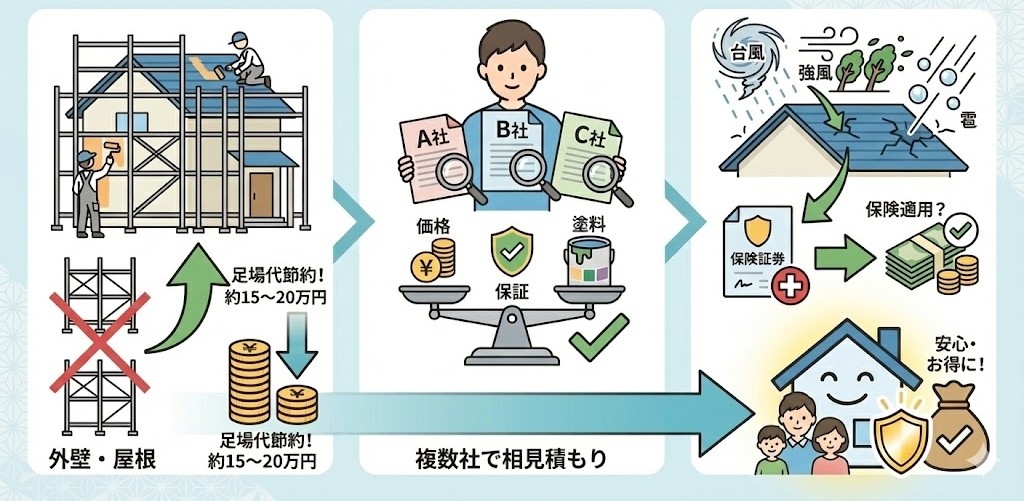 1.外壁塗装と同時施工 2.複数社で相見積もり 3.火災保険の活用 |