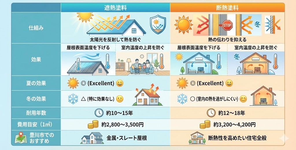 この記事では、豊川市で70年の実績を持つ屋根塗装専門店が、断熱塗料と遮熱塗料の違い・効果・費用・注意点をわかりやすく解説します。