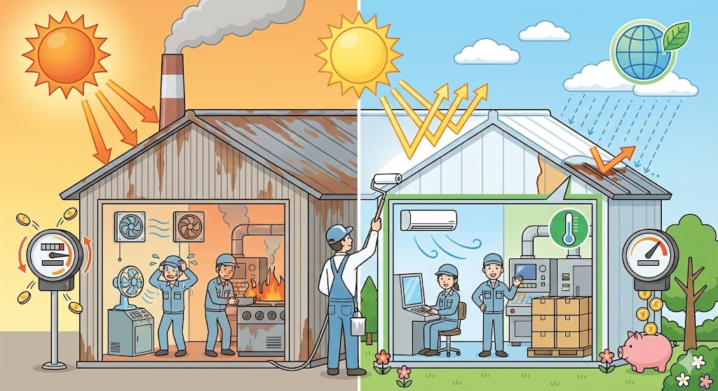 ●電気代の削減(空調費20〜30%カット) ●従業員の作業環境改善(熱中症リスク低減) ●機械・製品の劣化防止(温度管理が安定) ●屋根の耐久性アップ(塗膜が金属腐食を防止) ●CSR・環境対策にも有効(CO₂排出量削減) |