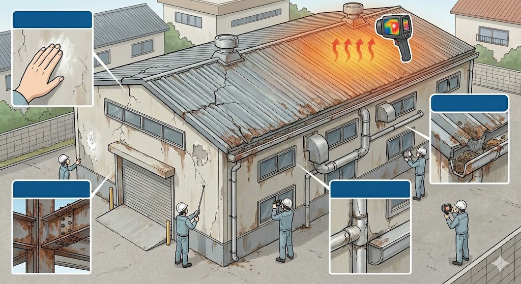 専門業者による劣化診断では、次のようなポイントを確認します。 ●外壁・屋根のチョーキング(粉化) ●鉄骨・ボルト部分の錆や腐食 ●屋根・外壁のひび割れやシーリング劣化 ●排水ドレン・雨樋の詰まり・腐食 ●換気ダクト・配管周りのシール劣化 ●塗膜の浮き・剥がれ ●屋根の温度上昇・遮熱性能低下 |