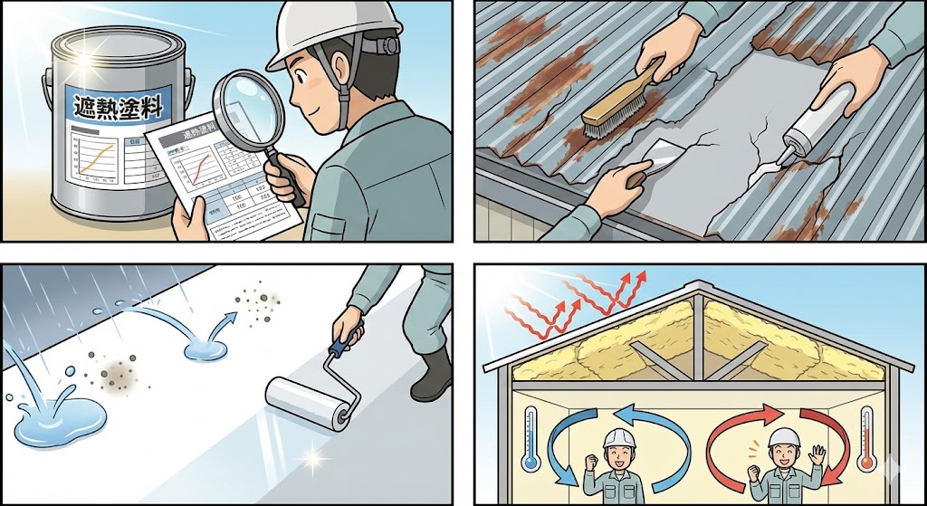 📌 豊川市のような日照時間が長く夏が蒸し暑い地域では、「遮熱塗料」+「高反射トップコート」の組み合わせが特に効果的です。
