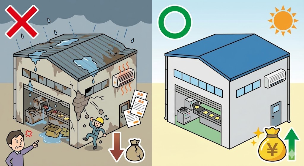 そんな中で、「雨漏り」「鉄骨のサビ」「外壁のひび割れ」などの劣化を放置すると、建物の資産価値だけでなく、生産性・安全性にも大きな影響を与えます。