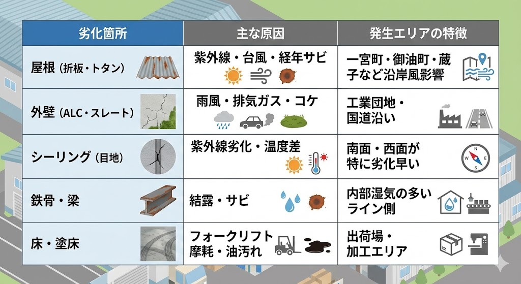 豊川市の工場・倉庫は、気候・潮風・風圧などにより劣化が進みやすい地域条件です。