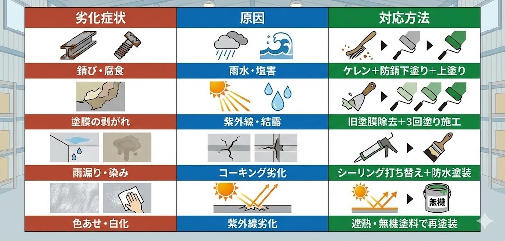 📌 築10年以上経過している倉庫は、**「錆びの発生」や「雨染み」**が出る前に再塗装を検討するのが理想です。