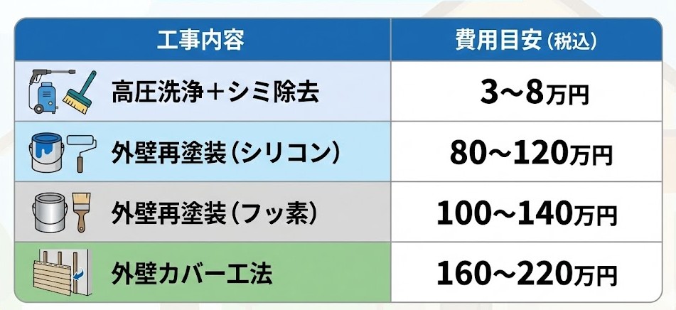 📌 ただし、外壁材そのものが変色している場合は、塗装だけでは完全に消えず「カバー工法」「張り替え」が選択肢になります。