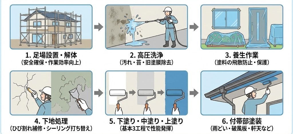 👉 この中で特に「下地処理」と「付帯部塗装」が省かれているケースが多いため注意が必要です。