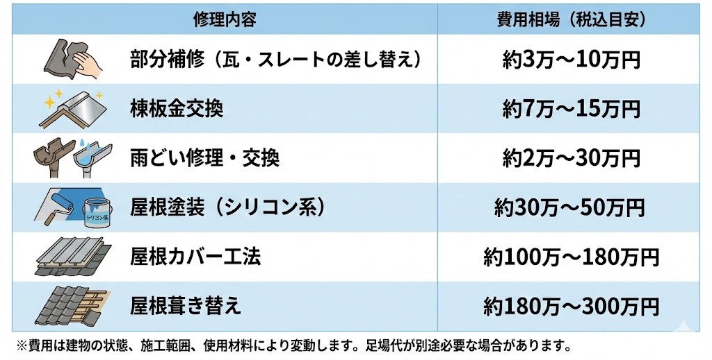 蒲郡市での屋根修理費用目安(30坪・税込)