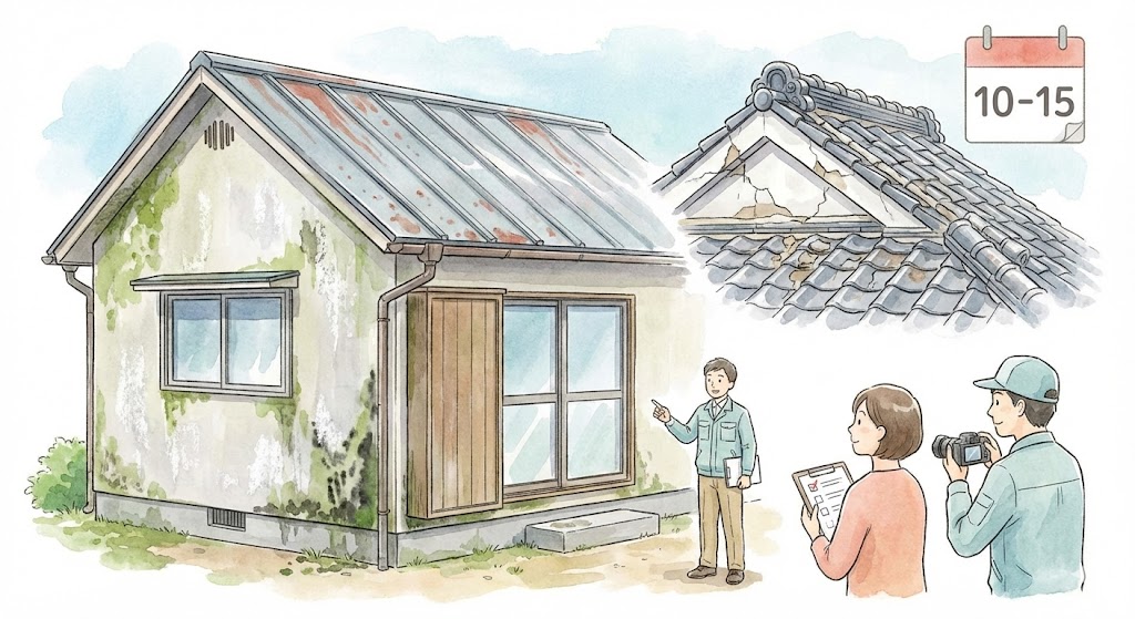 ●築10〜15年以上で塗装が色褪せてきた ●コケ・藻・カビの発生が目立つ ●金属屋根の表面に軽度のサビ ●瓦は健在だが漆喰が劣化している |
