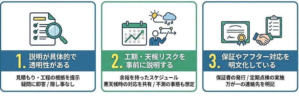 1.説明が具体的で透明性がある 2.工期・天候リスクを事前に説明する 3.保証やアフター対応を明文化している |