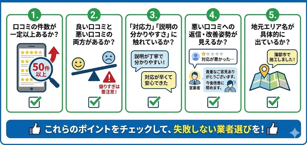 特に蒲郡市は、海沿い特有の気候(塩害・湿気・台風)によって建物が傷みやすいため、施工後の満足度や対応力が口コミに色濃く反映されます。
