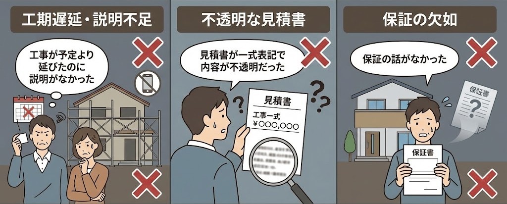 ●「工事が予定より延びたのに説明がなかった」 ●「見積書が一式表記で内容が不透明だった」 ●「保証の話がなかった」 |