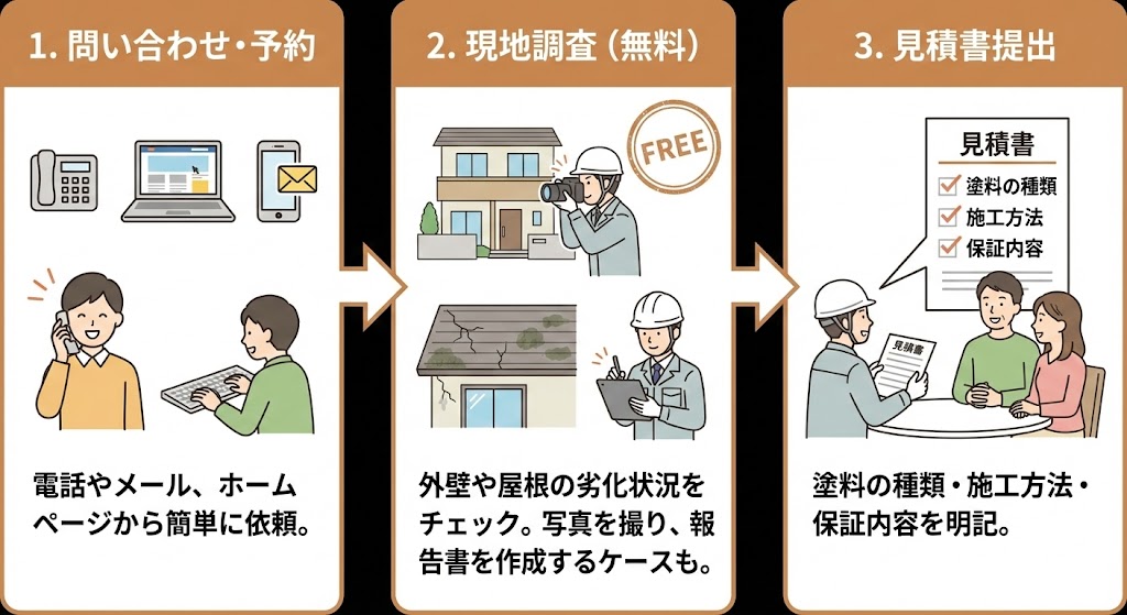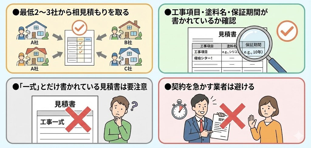 ●最低2〜3社から相見積もりを取る ●工事項目・塗料名・保証期間が書かれているか確認 ●「一式」とだけ書かれている見積書は要注意 ●契約を急かす業者は避ける |