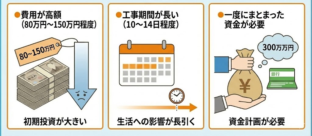 ●費用が高額(80万円〜150万円程度) ●工事期間が長い(10〜14日程度) ●一度にまとまった資金が必要 |