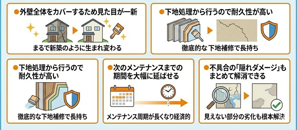 ●外壁全体をカバーするため見た目が一新 ●下地処理から行うので耐久性が高い ●次のメンテナンスまでの期間を大幅に延ばせる ●不具合の「隠れダメージ」もまとめて解消できる |