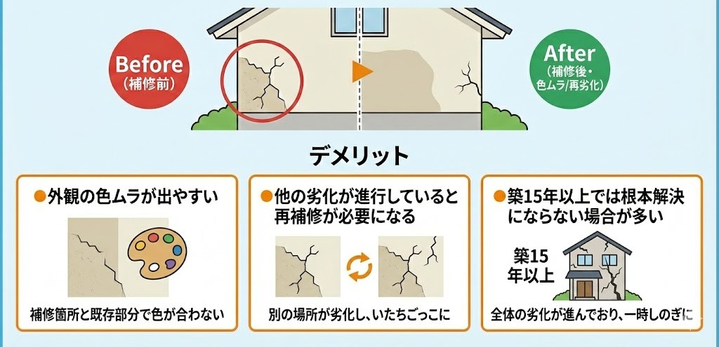 ●外観の色ムラが出やすい ●他の劣化が進行していると再補修が必要になる ●築15年以上では根本解決にならない場合が多い |